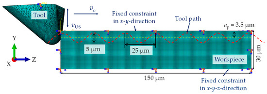 While the depth of cut in the real UVSM process was 30 µm (the distance between the workpiece surface and the zero position of the oscillation), implementing such a depth in the simulation model would lead to computational challenges due to the severely increased number of elements required. To balance computational efficiency and accuracy, a depth of cut of ap = 3.5 µm, which is 1 µm more as the ultrasonic amplitude AUS, was employed throughout the numerical simulations. This ensured that the tool remained in contact with the workpiece and removed material, considering the opposing forces from the material during chip formation.