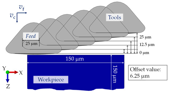 In the real UVSM process, the tool moves in three directions. Fluctuations in both rotational speed and ultrasonic frequency cause structural displacements from one feed path to the next feed path. To achieve this structural displacement in the simulations, the tools are arranged side by side in the direction of the feed motion with a distance (=offset value) equal to the wavelength of 25 µm (Figure 5). Furthermore, different offset values are set to achieve the desired structural displacements, listed in Table 4. Figure 5 illustrates the arrangement of six tools with a specified offset value of 6.25 µm relative to the workpiece. The use of multiple tools in simulations is necessary to replicate the structural displacement produced by a single tool moving as a feed in real experiments. By adjusting the spacing between the tools and their offset values, the desired structural displacement can be achieved.