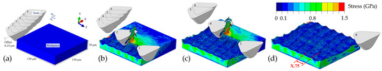 Figure 6 exemplarily shows a step-by-step evolution of the microstructure formation during the simulated UVSM process, incorporating the plastic deformation of the chip. The false color scale is a representation of the stress in GPa. In Figure 6a, the initial arrangement of the tools and the workpiece with an offset value of 0.25 µm, which provides a structural displacement of X.75, is exemplarily shown. This is followed by Figure 6b, where the first tool exits after cutting material from the workpiece. Simultaneously, the entry of the second tool is shown, accompanied by the cutting and deformation of the workpiece material to form an additional microstructure. The analysis of the von Mises stress shows that the greatest stress on the workpiece material prevails in the cutting zone as well as on the removing chip. Figure 6c again shows another state during processing by tool number four. The final state of the workpiece upon the sixth tool’s exit with a completely formed microstructure can be seen in Figure 6d.