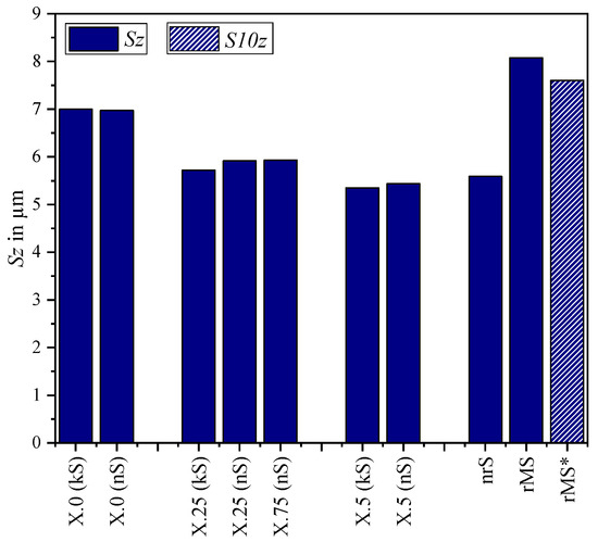 When analyzing the maximum height Sz, the 10-point height S10z for the real surface was also considered, as this value is more robust against outliers. However, these values are not useful for simulated surfaces as there are no such outliers. It is clear that the values between kinematic and numerical simulation are in a similar range, but there are differences between the structural displacements. While the highest values occur with X.0, those of X.5 are the smallest. This can be explained by the summation of kinematic roughness and vibration amplitude and was already analyzed in [13]. There is a more distinct difference between the near-real numerical simulation and the real surfaces. While the microstructure simulated using Abaqus can be compared with the structural displacement of X.5 in terms of maximum height, the peaks of the real surface have the largest value. This can be explained by imperfections or irregularities such as burr formation, as can be seen in Figure 1.