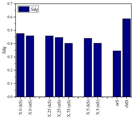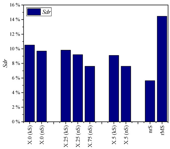 The diagrams of the root mean square gradient Sdq (Figure 9) and the surface magnification Sdr (Figure 10) show almost analogous trends. The larger the structural displacement becomes, the greater are the differences in the flank steepness between the simulation methods and consequently also in the surface magnification.
