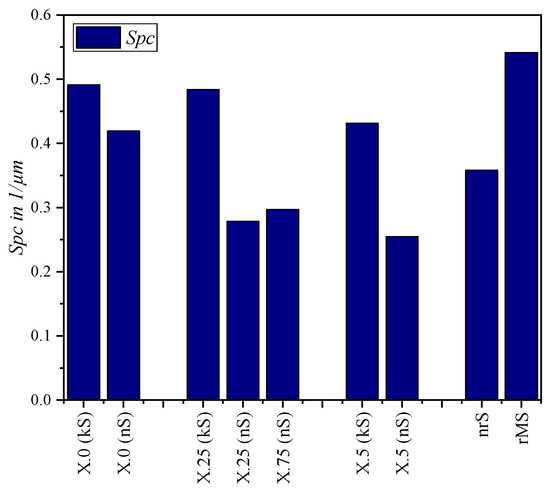 The parameter Spc indicates more significant differences between the two simulation methods, Figure 11. A direct comparison shows that higher values for the arithmetic mean peak curvature are achieved with the purely kinematic approach, which means “sharper” peaks. This can be explained by the modeling method used in the numerical simulation. The existing element mesh is not only “separated”, but also undergoes a high proportion of “deformation”, whereby the mesh elements are distorted. This results in smoothing effects, which are expressed by this parameter. The higher Spc value of the real surface compared to the near-real simulation indicates a higher burr formation, whereby the peaks have smaller radii. This finding also correlates with the other surface parameters considered so far.