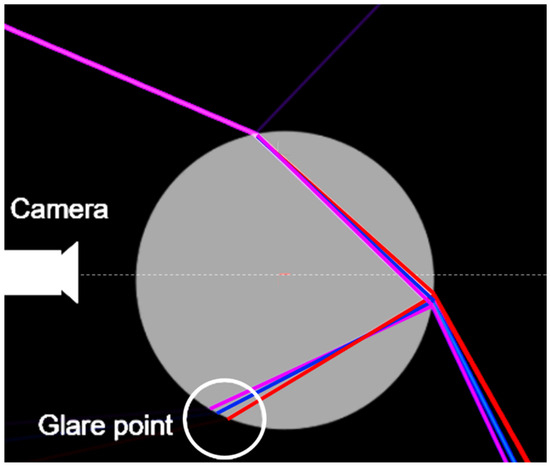 Simulation of the ray propagation of different wavelength (405 nm, 465 nm, and 635 nm) hitting a droplet, demonstrated by the gray circle (refractive index of water 1.33 was applied), at an angle of approx. 40°. The difference in reflection angles due to the different wavelengths results in the slightly shifted position of the glare points (white circle) depending on the wavelength, after being reflected on the inside of the droplet [16].