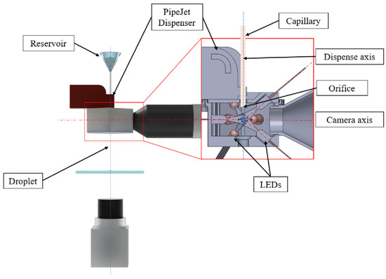 In order to replicate the functionality of a Drop-on-Demand material jetting bioprinting device, a non-contact nanodispenser (PipeJet Nanodispenser, BioFluidiX, Breisgau, Germany) was employed. The device is equipped with a deformable polyimide capillary (Zeus Inc., Orangeburg, SC, USA) with an internal diameter of 250 μm. The length of the capillary is 200 mm. One end of the capillary is fluidically coupled with a reservoir (Eppendorf 1.5 mL tubes, Thermo Fisher Scientific, Waltham, WA, USA) containing different test liquids, including suspended particles or spheroids. Capillary forces draw liquid through the capillary.