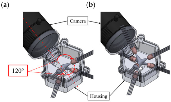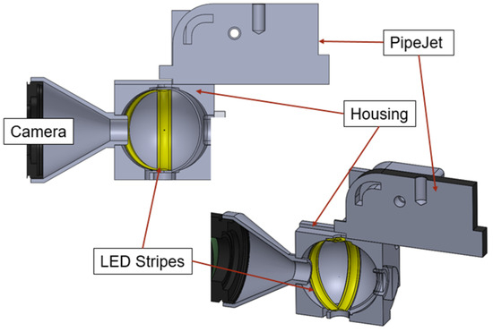 Rather than using direct illumination of the droplets, LED stripes (24 V, 3 W, 100 lumens) were used. The white light emitted by the LEDs scattered diffusely due to the coating on the stripes. The walls of the housing to which the stripes were attached in this concept were spherical in shape, as shown in Figure 5. The color of the housing was chosen to be white to enhance the reflection and diffuse scattering of the light emitted by the LED stripes. Thus, light penetrated the droplets from all directions and overcame the focusing behavior of the droplets. The setup was mounted to the experimental setup described in Section 2.2.