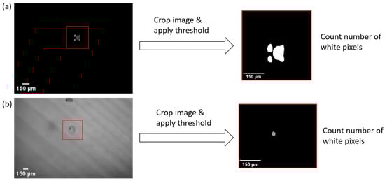 For this approach, it is assumed that images containing particles should have a higher or lower number of white pixels because the glare points change in their appearance or appear or disappear, leading to an increase or decrease in the number of white pixels. Consequently, the mean pixel value also changes. The same holds true for the images captured with diffuse illumination. A cut-off value is defined by calculating the average mean value of ten empty droplet images. A margin of 15% of that value is added to define the particle detection cut-off. All images of droplets above that cut-off are considered to contain a particle. This method is called the white pixel count (WPC).