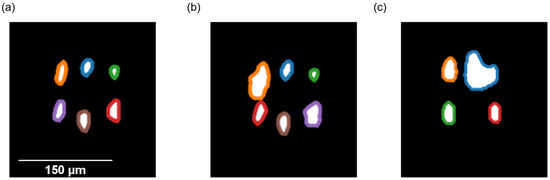 (a) Image of an empty droplet with six contours that were drawn around the glare points by the algorithm. (b) Image of a droplet containing a bead particle. The area enclosed by the orange contour increases in size. (c) Image of a droplet containing a bead particle. The brown glare point disappeared whereas the blue one increased in size.