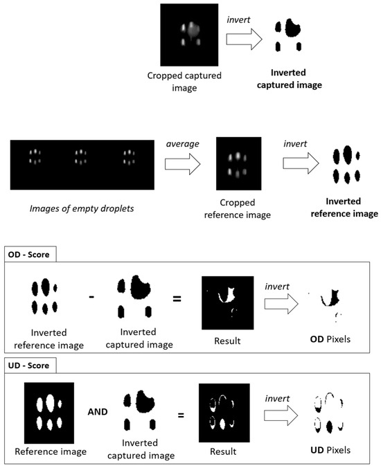 Another method to determine differences in images of droplets with or without an enclosed particle is the calculation of droplet image similarity (DIS), which is determined based on the printing accuracy model developed by Fritz Koch et al., 2023 [21]. It consists of three scores. One counts the number of pixels that change color from black to white in an image compared to a reference image (OD). The second score counts the number of pixels that are missing (change color from white to black) compared to a reference image (UD). Both scores combined lead to the third score, which indicates the similarity of the captured image to the reference image (DIS). The reference image in the case of the droplet images was calculated using the mean of 20 images of empty droplets. The equations of the scores, as well as the determination of the scores by image processing, are shown in Figure 8. The binarization of the images was performed by applying the Otsu threshold to the images. To compensate for positional discrepancies between the droplets in the captured images, a template-matching algorithm was employed. This algorithm convolved a reference image with the captured images in two dimensions, thereby identifying the coordinates where the two images exhibited the greatest degree of alignment.