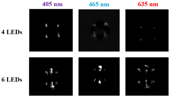Empty droplets illuminated by four and six LEDs in the arrangement as shown in Figure 2 with different wavelengths. The size of droplets varied in the range of 80 μm up to 130 μm.