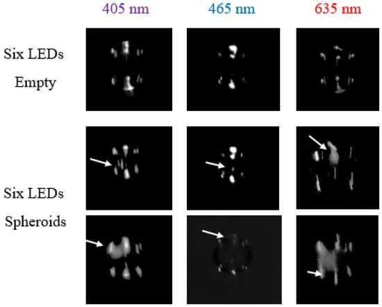 Series of captured images of droplets with different wavelengths of illuminating light. The change of glare points, which indicates a detection of spheroids, is marked with arrows. The droplet size was in the range of 80 μm up to 130 μm.
