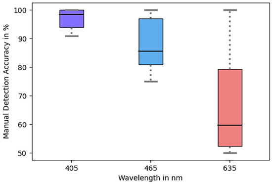 The detection accuracy of the version with violet light was more constant and on average higher (93.8%) than with red (59.2%) and blue (84.3%) light. This corroborates the observation that light of a shorter wavelength is deflected more strongly by particles with shorter wavelengths, resulting in greater alterations in the size and intensity of the glare point. The distribution of the accuracies can be seen in Figure 11.