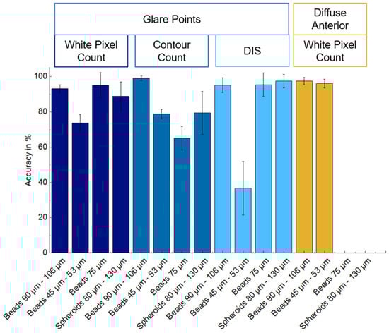 Table 2 presents the results achieved by the white pixel count algorithm based on images captured with the diffuse illumination concept. The algorithm demonstrated an accuracy of greater than 95% for blue-colored beads with a size range of 45 μm to 106 μm. However, the algorithm was unable to detect spheroids and transparent beads, as illustrated in Figure 12. The diffuse illumination resulted in diffuse light reflections indistinguishable from spheroids and transparent particles. Nevertheless, the evaluation algorithms indicated that the accuracy for light-absorbing colored particles was higher than that achieved with the directed light concept. Figure 13 provides a side-by-side comparison of the achieved accuracies. The processing of glare point images, in particular with the DIS algorithm, is most effective for transparent particles and spheroids. This is due to the fact that pronounced changes in the glare point appearance can be easily distinguished from empty droplet glare point images.