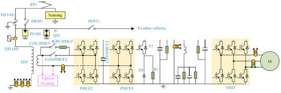 The traction converter is mainly composed of IGBT module. The four-quadrant rectifier is composed of PMCF1 and PMCF2. The overvoltage suppression circuit is composed of T1, D1 and R1. The traction inverter is composed of six IGBT modules, as shown in the OND part in Figure 1.