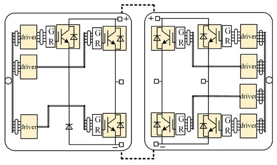 Figure 1 displays the traction electric drive system’s primary circuit diagram. The traction transformer, traction converter, and traction motor make up this system []. The traction transformer receives AC power from the catenary to provide power for the whole train. The traction motor converts electric energy to kinetic energy to drive the whole train forward. Traction converter is the core part of this system, which is mainly composed of four quadrant rectifiers, an over-voltage suppression circuit and a traction inverter. Different circuits have different functions, but their cores are IGBT modules.