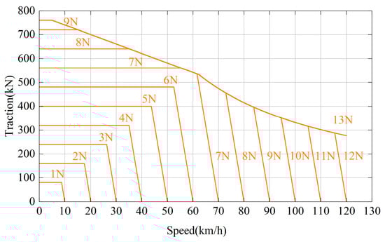 The working principle of traction inverter is basically the same, but the working conditions vary greatly with the different routes. As shown in Figure 3, the traction characteristic curve of the HXD2 electric locomotive is given, and the traction characteristic curve of the control handle in different gears N is marked in this figure []. The gears N of the train are divided into 13 levels, the curve of which corresponding to the 13-level gear is the maximum traction characteristic curve of the traction converter.