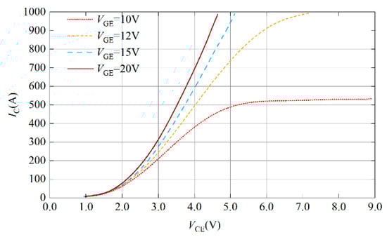 As shown in Figure 6, the output characteristic curve of the traction-grade IGBT module FD500R65KE3 is given. The on-state voltage drop of IGBT gradually decreases with the increase in the gate voltage. Therefore, the loss of IGBT can be reduced by increasing the gate voltage.
