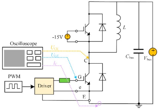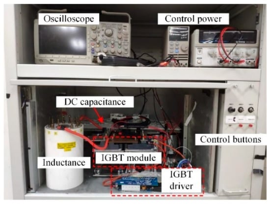 The experiment is finished using the double-pulse circuit, which confirms the logic of the intended IGBT driving circuit. In Figure 16, the test platform is displayed. Mitsubishi’s CM1200HC-66H IGBT module is chosen by the IGBT module. There is a load inductance of 100 uH and a DC bus voltage of 1800 V. The upper tube’s GE terminal is shorted in the double-pulse test to put it in a dependable shutdown state. The double pulse signal is sent to the lower tube. The load current increases to the predetermined value by varying the length of the first pulse width.