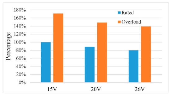 In order to verify the influence of gate voltage on the loss of IGBT, the switching characteristic test circuit shown in Figure 7 is built in PSpice simulation software. The relevant simulation parameters are shown in Table 4. IGBT operating circumstances are separated into two categories during the simulation: rated condition and overload condition. The collector current flowing through the IGBT is the rated value while operating under rated conditions. Under overload condition, the collector current passing through the IGBT is 1.5 times the rated value. The switching frequency of the IGBT is 800 Hz and the duty cycle is 50%. Figure 8 shows the loss change of the FD500R65KE3 under different gate voltages and different working conditions. The loss data of the IGBT is normalized, and the loss data under the rated working condition of the 15 V gate voltage is used as the reference value. The percentage change of IGBT loss under different working conditions is obtained. Figure 8 shows that under overload conditions, the IGBT loss will significantly increase; however, the IGBT loss can be decreased by raising the gate voltage.