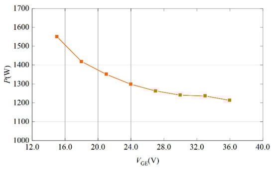 Based on the above research mechanism, the loss of FD500R65KE3 under different gate voltages is simulated in PSpice, as shown in Figure 10. The loss of IGBT gradually decreases with the increase in gate voltage, but the rate of decrease is smaller and smaller. When the gate voltage increases to a certain extent, the effect on the loss is very small.