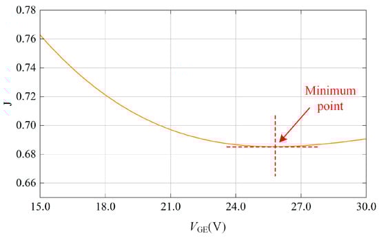 The focus of this paper is to reduce the temperature fluctuation of IGBT. Therefore, more attention is paid to the effect of the gate voltage on the loss, and the α value is selected to be larger. Figure 11 shows the variation curve of the objective function J with the gate voltage when α = 0.7 and β = 0.3. The curve is not monotonic, and the minimum value is obtained when VGE = 25.8 V. At this time, the working characteristics of IGBT device are optimal. In the actual design, the gate voltage of IGBT is usually selected as 26 V.
