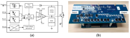 This work introduces a boost gate voltage circuit based on the features of typical IGBT drive circuits, such as under-voltage protection, active clamping, short-circuit protection, and gate protection. Under specific operating conditions, the circuit can increase the gate voltage from +15 V to +26 V, which will lower the IGBT loss. The function block diagram of the IGBT drive circuit with boost gate voltage is shown in Figure 12a, and the physical diagram is shown in Figure 12b. The driving circuit includes a signal input part, a power supply part, a protection part, a signal processing part, and a power amplifying part.