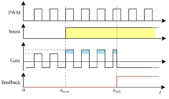 PWM and boost signals are the two signals that make up the drive circuit’s signal input section. To ascertain whether the boost gate voltage circuit is operating, the two signals are combined. In order to make sure that the TCU is aware of whether the IGBT is malfunctioning, the drive circuit also incorporates a feedback function. Figure 13 displays the timing of the driving circuit. Upon a low signal, the driver circuit produces an output of +15 V/−12 V. At tboost, the boost signal becomes high and the gate boost circuit starts to work. +26 V/−12 V is the driving circuit’s output. IGBT has a short circuit fault at tfault. To turn off the IGBT, the driver circuit outputs a negative voltage right away.