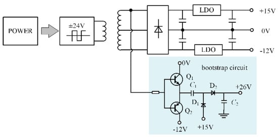 External power pulses at a voltage/frequency of ±24 V/35 kHz are used to supply the drive power. Diode rectification and linear voltage regulator devices are then used to acquire the voltages of +15 V and −12 V. The power is designed to be 15 W, which satisfies the driving power requirements. The bootstrap circuit realizes 26 V, and Figure 14 displays the precise circuit schematic diagram.