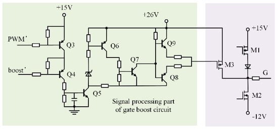 The circuit diagram for the power amplifying and signal processing components of the gate boost circuit is displayed in Figure 15. The IGBT’s current capacity is increased when M3 is turned on because the gate voltage is pumped up to +26 V.