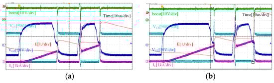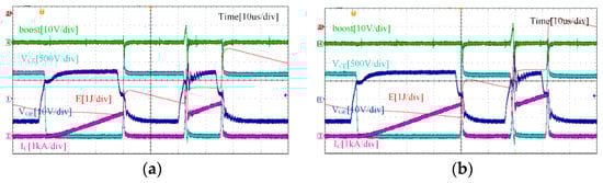 IGBT test circumstances are separated into two categories throughout the duration of the experiment: rated condition and overload condition. Under rated condition, the busbar voltage is 1800 V and the collector current is 1200 A. Under overload condition, the bus voltage remains at 1800 V, but the collector current becomes 1.5 times, which is 1800 A. As shown in Figure 17 and Figure 18, the double-pulse waveforms under the traditional driving strategy (+15 V gate voltage) and the boost driving strategy (+26 V gate voltage) are given. The drive circuit can sustain the dependability of the driver circuit and can raise the IGBT’s gate voltage by activating the boost signal, which confirms the dependability of the function of boosting the gate voltage, according to a comparison of the experimental waveforms.
