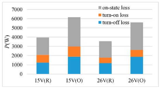 When the working frequency of the IGBT is 800 Hz and the duty cycle is 50%, the loss calculation results are shown in Figure 19. O denotes an overload condition, while R denotes a rated condition.