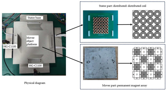 At present, magnetically levitated planar micromotors usually use the design scheme of integrated levitation and displacement [28]. This paper adopts a structure where levitation and displacement are separated. A distributed circular coil array is selected as the stator, and a two-dimensional Halbach permanent magnet array is selected as the mover, reducing system coupling and enhancing controllability. The distributed coil magnetically levitated planar micromotor is shown in Figure 1.