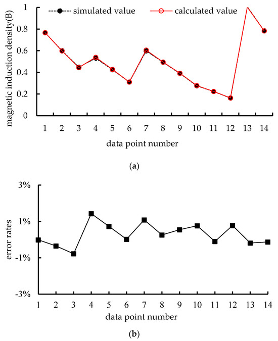 Results of magnetic field density: (a) comparison results between calculation and simulation, (b) error rates.