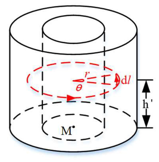 Assuming that the center of the bottom of a coil is located at the coordinate within the Halbach permanent magnet array and that each layer of current loops is counted from the innermost to the outermost coil with and from the bottom to the top layer with , then one current loop can be determined. The -th current loop is taken for analysis, with a radius of , a height of , and a center angle of , as shown in Figure 3.