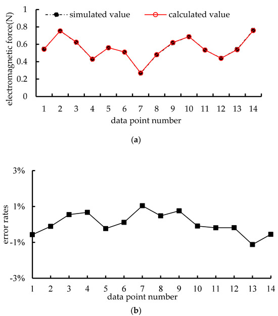 Results of electromagnetic force: (a) comparison results between calculation and simulation, (b) error rates.