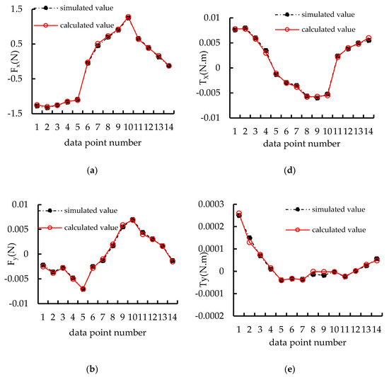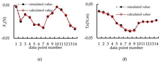 Result of electromagnetic forces and torques: (a) comparison results between calculation and simulation of ; (b) comparison results between calculation and simulation of ; (c) comparison results between calculation and simulation of ; (d) comparison results between calculation and simulation of ; (e) comparison results between calculation and simulation of ; (f) comparison results between calculation and simulation of .