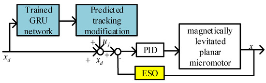 In the design of motion control strategies, it is necessary to propose more advanced control strategies to address the impact on control precision of unknown disturbances in the magnetically levitated planar micromotor and repetitive errors generated during motion. PID is the most typical control strategy [15]. It has the characteristics of a simple control algorithm, strong adaptability, etc., and has been widely used in practical manufacturing. The application of cascade PID control in the controller design for magnetically levitated actuation improves the quality of the system control, but the stability of the system remains poor [16]. On this basis, fuzzy PID was developed for better steady-state accuracy and dynamic responses [17]. Zhou et al. [18] proposed a hybrid fuzzy decoupling control strategy for the leveling and positioning of magnetic levitation wafer carriers. It mainly adopts a primary–secondary structure consisting of a linear primary decoupling control term and a nonlinear secondary intelligent compensation term, aiming to improve the transient stability of the system. In recent years, adaptive robust control has usually been used in the presence of parameter uncertainties and external unknown disturbances in system models [19]. Hu [20] proposed an adaptive robust control strategy for addressing the impact of uncertainty on control accuracy in magnetic levitation platforms, but the design of the control law is complicated. To enhance system stability and robustness, both feedforward and feedback controllers are proposed. In complex excitation environments, issues such as large strokes and uncertain excitation amplitudes in quasi-zero-stiffness isolators can lead to decreased isolation performance and stability. Therefore, a hybrid time-delayed feedforward and feedback controller is proposed to enhance robustness and stability [21]. To enhance the system’s disturbance rejection capabilities, Ma, T. [22] utilized an extended observer to observe external disturbances in the system and provide feedback compensation, thereby achieving improved robustness. At present, the iterative learning control (ILC) strategy is often used as feedforward control to address the impact of repetition errors on control accuracy during reciprocating motion [23]. However, ILC is quite sensitive to uncertain disturbances, parametric uncertainty, and noise, which leads to limitations in industrial applications [24]. Using neural networks to replace iterative learning control is considered. The neural network is equivalent to a black box, predicting tracking errors based on input–output data to approximate the desired trajectory of the control system [25]. To address parameter variations and uncertainties in system models, a neural network learning adaptive robust controller (NNLARC) is adopted, but its prediction accuracy is not high [26]. Therefore, a GRU control strategy [27] is proposed for constructing a GRU neural training network to accurately predict tracking errors. The predicted part is applied as feedforward compensation in the controller, further improving the control accuracy of the control system.