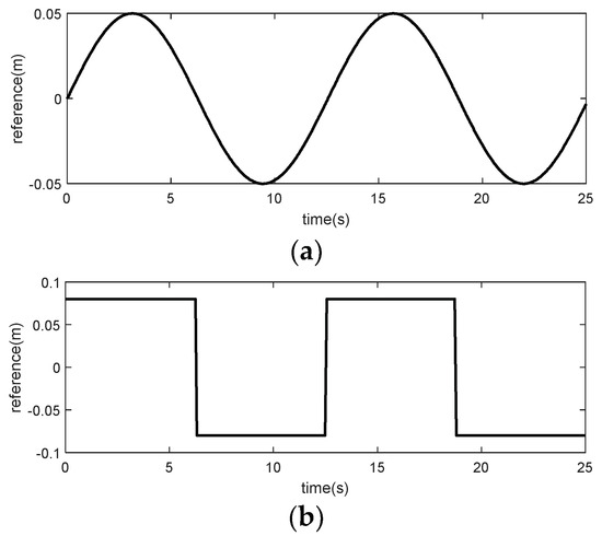To validate the effectiveness and correctness of the proposed control strategy, two different kinds of reference trajectories shown in Figure 10 and disturbances shown in Figure 11 are used. The first is a sine curve, ; the second is a square wave curve, , .