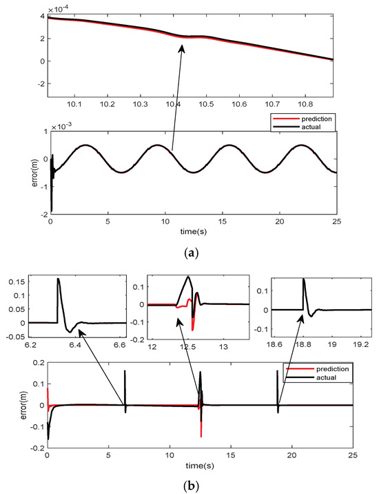 Figure 12 shows the comparison between the prediction error and the actual error from the trained GRU network. According to (a) and (b) in Figure 12, the trained neural network almost precisely predicts the contouring errors for two completely different trajectories, demonstrating not only the efficiency but also the correctness of the prediction method. The accurate error predicted by the trained GRU network is used as feedforward compensation in the motion trajectories of the distributed coil magnetically levitated planar micromotor, thus constituting the GRU-ESO control strategy.