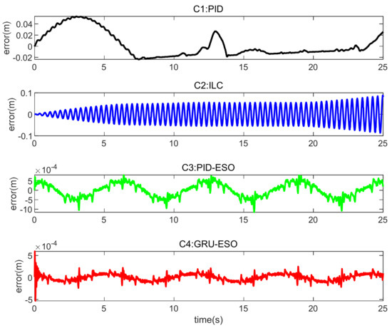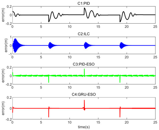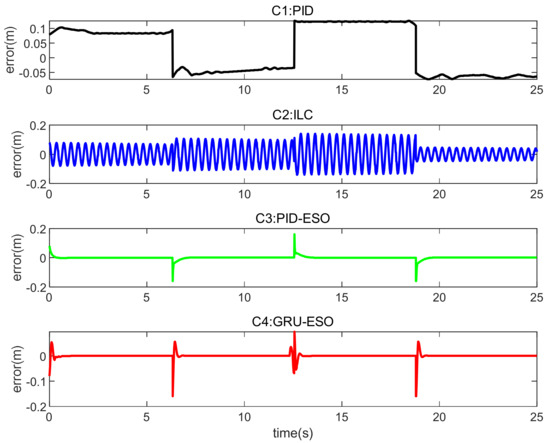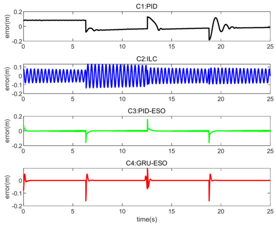 The tracking errors for different controllers and sets in cases are shown in Figure 13, Figure 14 and Figure 15 and Figure 16, Figure 17 and Figure 18 respectively. The detailed quantitative indices are further shown in Table 3 and Table 4. Both Table 3 and Table 4 show that the proposed GRU-ESO control strategy has good tracking control accuracy.