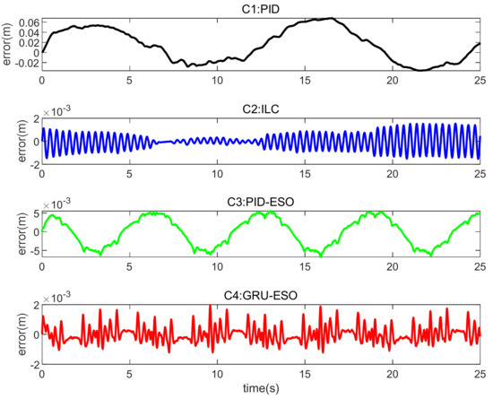 In Figure 13, it can be observed that the tracking accuracy results for the different controllers in Set 1 are essentially similar. C1 (PID) performs slightly better, but still has significant residuals. The proposed C4 (GRU-ESO) further improves performance through feedforward compensation based on the GRU. It is worth noting that the performance of the proposed C4 is even comparable to that of C2 (ILC), while avoiding the time-consuming iteration steps in C2.