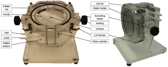 The electrochemical deposition (ECD) took place in a plating cell, which is shown in Figure 1. This cell was placed inside the glovebox. It was configured for the use of ILs, as they are very corrosive to different polymers. The cell itself was designed and purchased from silicet AG, now silicet VX consulting GmbH (Obergröningen, Germany). The cell consists of a glass cylinder, which is placed between two PMMA components on the bottom and the top. On the bottom side, the IL is pumped into the cell (inlet) using a tube pump. The tubes are connected to the IL tank containing two liters of IL which is a bit more than needed to fill the plating cell completely. Inside is a doubled PMMA cylinder on which the Al anode is placed. This inner cylindric set up can be adjusted in height; thus, the anode–cathode distance can be adjusted. In this study, the distance was constant at 2 cm. On the top PMMA part, the wafer holder is placed with down-facing wafer and fixed with the cell lid. For the deposition process, the complete plating cell can be swiveled at 180°. Thus, the wafer is facing up during the plating process.