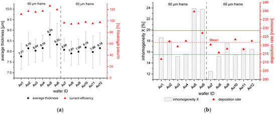 (a) Average thickness [µm] and current efficiency [%] over the 12 wafers with the Au seed layer. (b) Inhomogeneity [%] and deposition rate [nm/min] over the 12 wafers with the Au seed layer. The grey striped line between Au6 and Au7 indicates the change from the 80 µm to 60 µm frame layout.