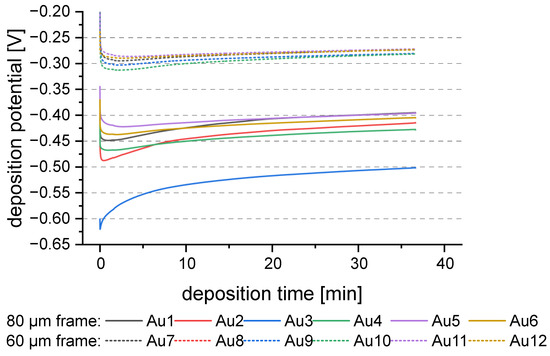 Wafers Au5 and Au6 show higher standard deviation and higher inhomogeneity than the other wafers. The deposition rate of Au5 was higher than the other wafers and is outside the standard deviation (see Figure 3b). In comparison, the deposition potential was lower than the other 80 µm frame wafers, Figure 4. However, the difference to Au4 is less than 50 mV at the end of the process, which should not influence the process that much. On the contrary, since the potential of Au3 is greater than −0.53 V, strong dendritic growth should occur [20]. This would result in high inhomogeneity. This is not the case. Therefore, it could be more likely that the inhomogeneity of the deposition is negatively influenced by the time interval between plasma treatment and deposition. But the wafers Au11 and Au12 were deposited at the same time interval. Those samples show an average inhomogeneity and deposition rate. To summarize, the difference in inhomogeneity for Au5 and Au6 cannot be described with the existing data and might be outliers within the process. More data would be necessary on the Au seed layer to evaluate the behavior further.