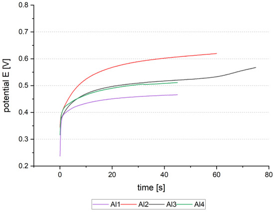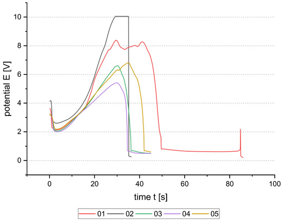 In Figure 5, potential–time (E-t) dependencies of the anodic reverse pulse are shown for five samples. The sample 01 was prepared with 120 s. The process time was chosen according to the maximum charge of 1.5 C with a buffer of 0.3 C for 120 s. The E-t-curve of sample 01 shows a plateau at approx. 8 V and the potential drop at 50 s to a nearly constant value of 0.6 V. After 85 s, the process stops as there is no connection to the seed layer anymore. The total amount of charge was 0.85 C. The charge is lower than the theoretical charge needed to dissolve the whole 500 nm thick seed layer. On the chip, only a few parts of Al are left, which cannot be dissolved as the electrical contact was dissolved at the top edge.