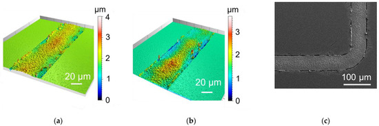 After electrodeposition, the resist was removed wet chemically with a commercial resist remover (TechniStrip P1331, MicroCemicals GmbH, Ulm, Germany). The layer thicknesses were measured using confocal microscopy (CL200, Confovis GmbH, Jena, Germany) with a mapping function. The program measured 59 dies per wafer. As the dies were measured at the bottom left corner of the bonding frame, the layer thickness was analyzed in the x and y direction at one bonding frame. Thus, 118 measurement points were available to calculate the average thickness, daverage, of the bonding frames, their standard deviation (Std. dev.), and the wafer inhomogeneity X. The inhomogeneity was calculated using Equation (1).