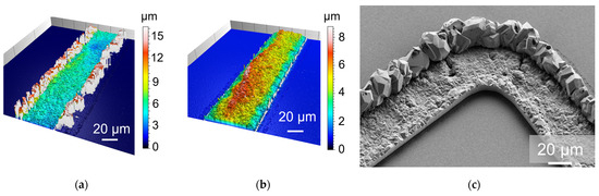 First, pulse plating was utilized with similar parameters as during the deposition of Au seed; see Table 1. For sample Al1, almost no deposition can be recognized; Figure 8. This could be due to insufficient oxide removal or too high a current density combined with pulsed plating. Sample Al2 shows better overall growth using half the current density of Al1; Figure 9. However, the frame edges are strongly raised, which can be seen from the confocal microscope (Figure 9a) and SEM (Figure 9c) picture. After an adhesion test using a tape, the raised regions are removed and stuck at the tape (Figure 9b).