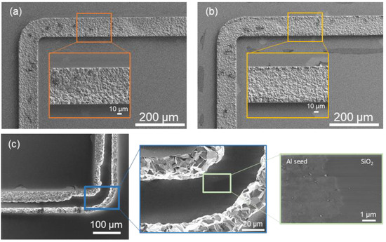 The deposition was carried out using pattern plating and the same lithography masks for both seed layers; see Figure 2. Those masks include some current collectors on the outside to achieve a more homogenous electric field distribution on the bonding frame patterns. The bonding frames have a width of 60 and 80 µm, respectively. After lithography, the wafers were treated with plasma to remove resist residuals in the patterns. For the Au seed layer, oxygen plasma for 2 min was applied. The individual plasma process parameters for the Al seed layer are listed in the Results Sections for a better overview.