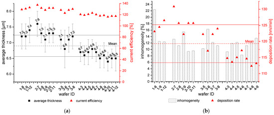 (a) Average thickness [µm] and current efficiency [%] for different wafer lots on the Al seed layer. (b) Inhomogeneity [%] and deposition rate [nm/min] for different wafer lots on Al seed. The dashed lines indicate the mean value of the average thickness (a) and deposition rate (b). The solid lines indicate the standard deviation of those.