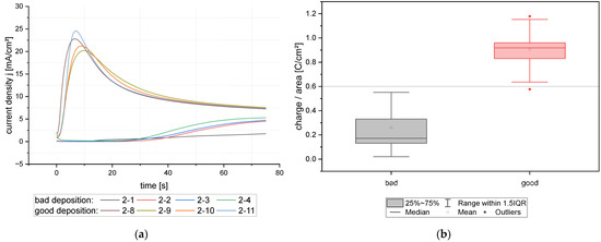 (a) Current density–time curves during the anodic reverse pulse for 8 exemplary samples of good and bad deposition result; (b) categorized good and bad samples in relation to the charge per area during the anodic reverse pulse. The grey line visualizes the threshold at 0.6 C/cm2.