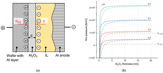 The equation for calculating the film pressure was derived in detail by Sato; thus, here, only the result in the SI system instead of the Gauß system is given in Equation (7), whereas is the relative permittivity of Al oxide film (assumed to be 9 [35]), and is the vacuum permittivity (. The first term indicates the electrostriction force on the Al oxide film, while the second term is the interfacial tension effect. This equation is used to generate Figure 1.
